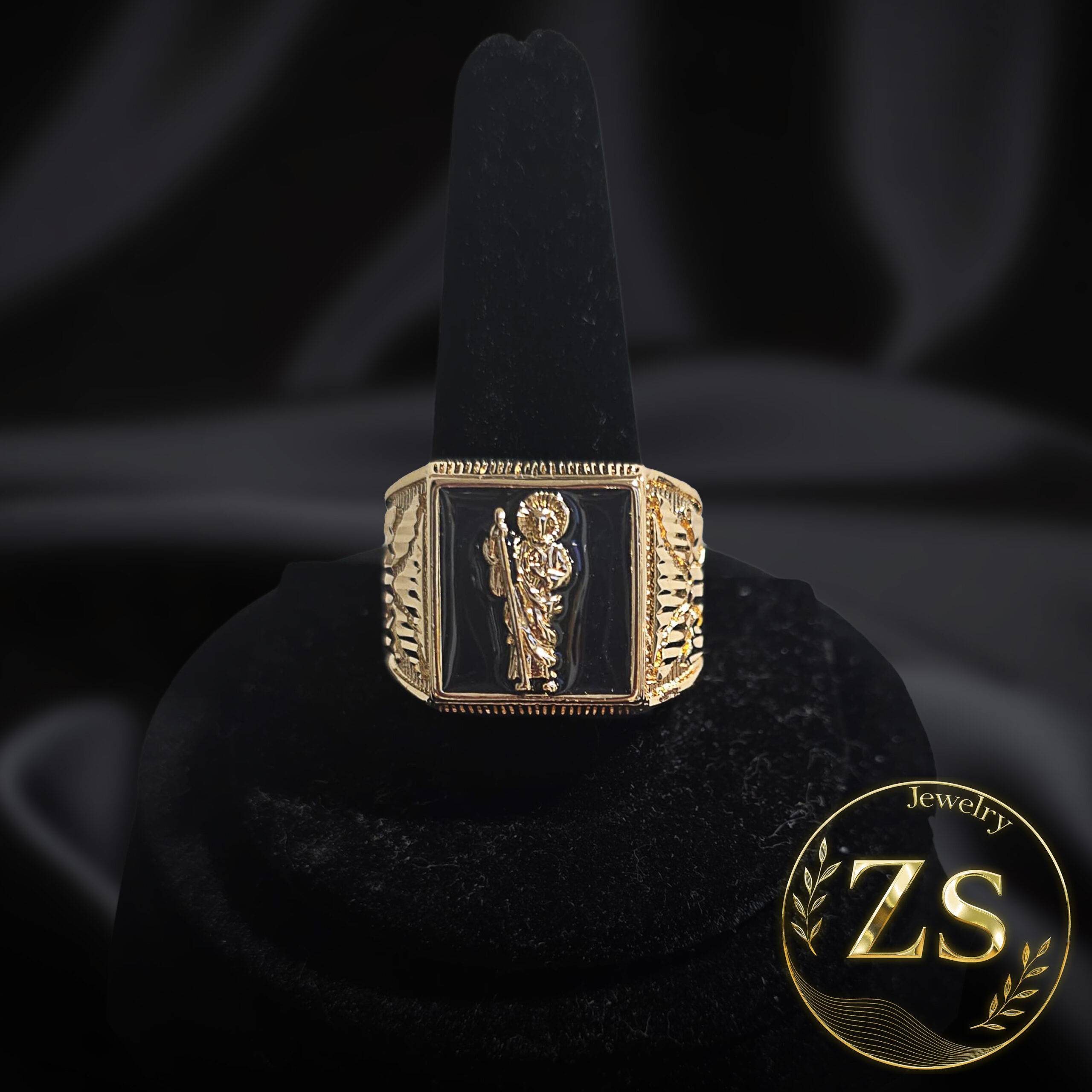 Anillo tipo sello con una placa rectangular de esmalte negro y la figura de San Judas Tadeo en relieve dorado. Una joya devocional con hombros ornamentados, presentada sobre el maniquí en fondo negro.
