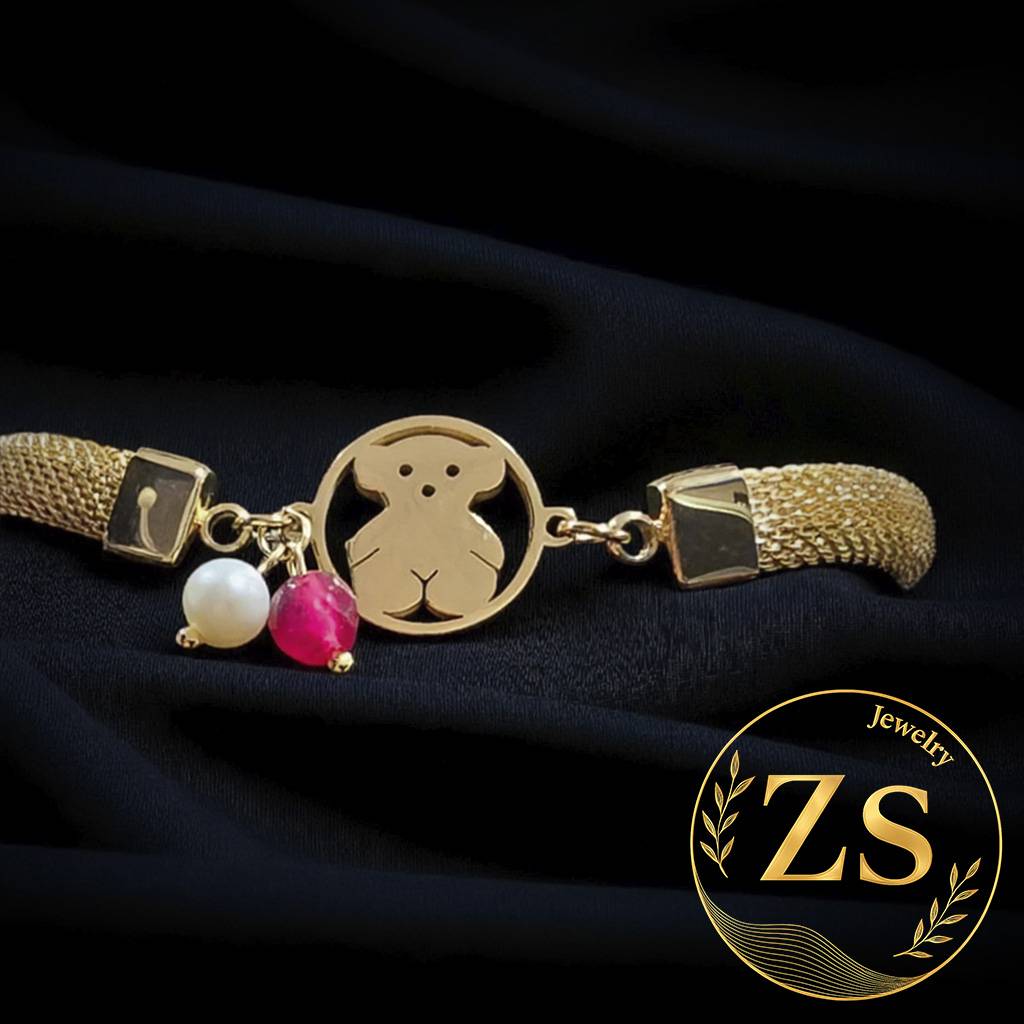 Este encantador brazalete combina elegancia y un toque juguetón, ideal para añadir un detalle distintivo a cualquier atuendo. Su diseño presenta una sofisticada cadena trenzada en tono dorado, que se complementa con un delicado charm de oso troquelado y abalorios de perla y cuarzo. Es la pieza perfecta para quienes buscan un accesorio versátil que destaque tanto en ocasiones casuales como especiales.