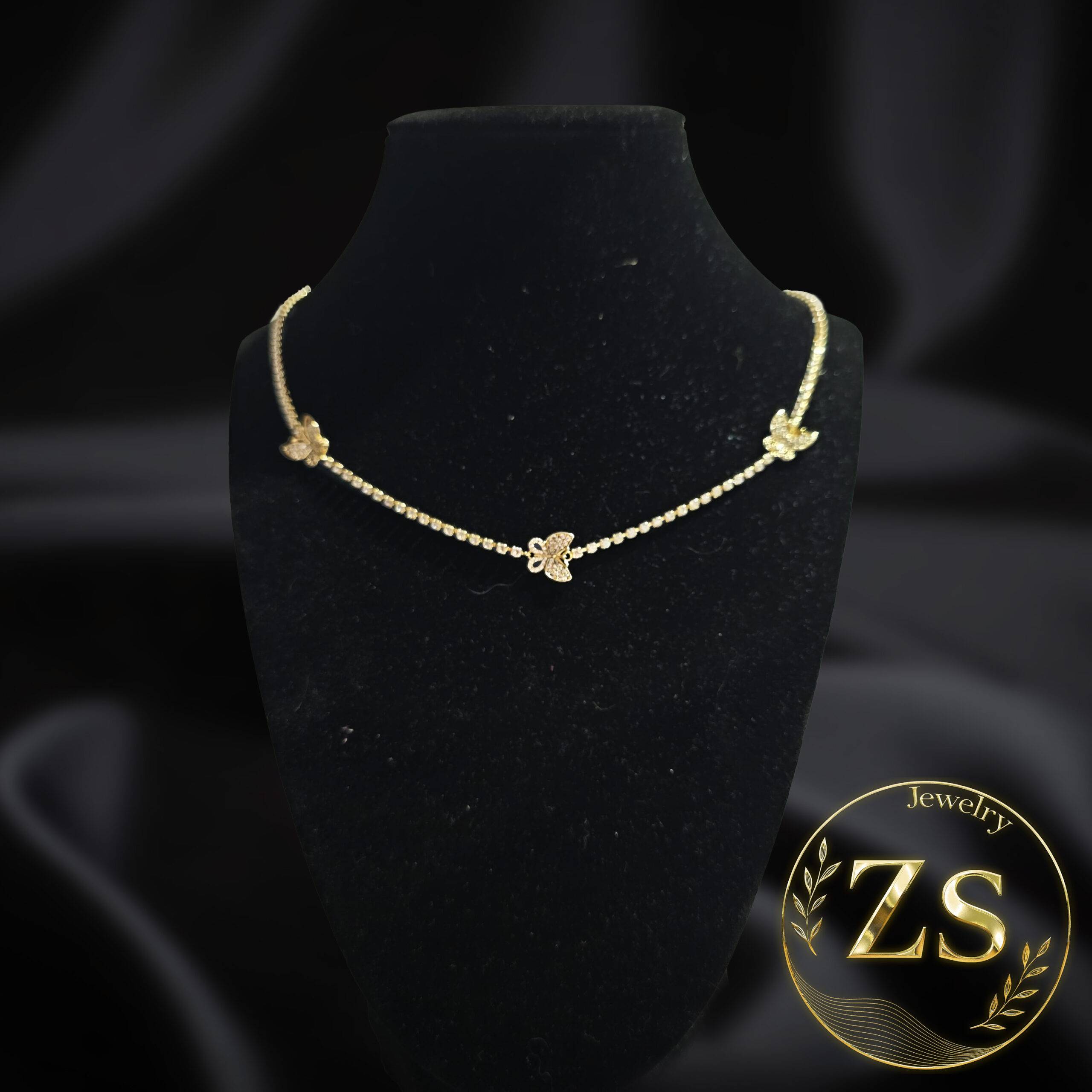 Collar estilo estación con cadena de circonitas y tres mariposas en tono dorado, sobre un maniquí en fondo negro. La delicadeza de la transformación y la libertad brillando en tu cuello.