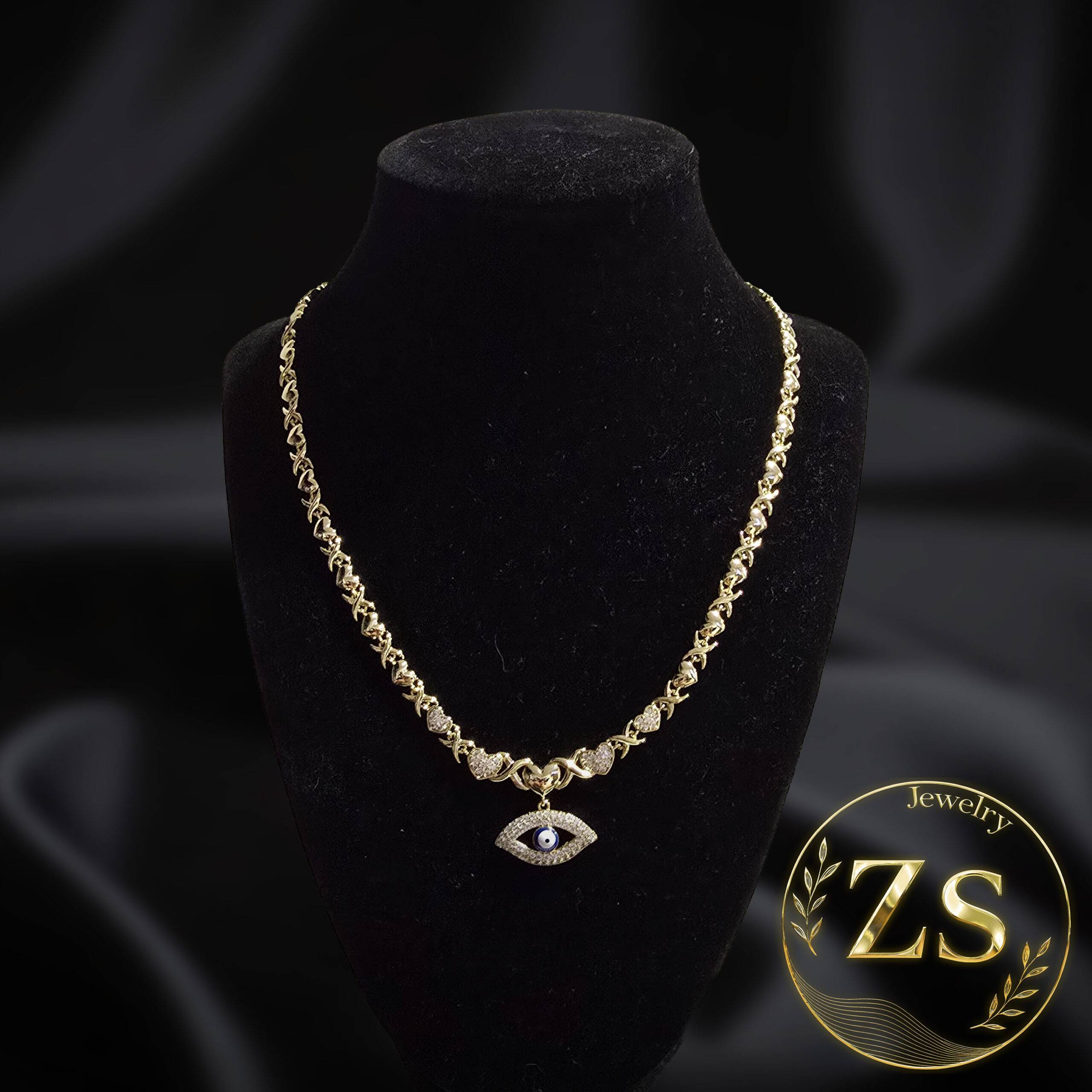 Collar de cadena de eslabones tipo X con colgante central de Ojo Turco pavé, sobre un maniquí en fondo negro. La protección se une a la moda con un diseño atrevido y sofisticado.