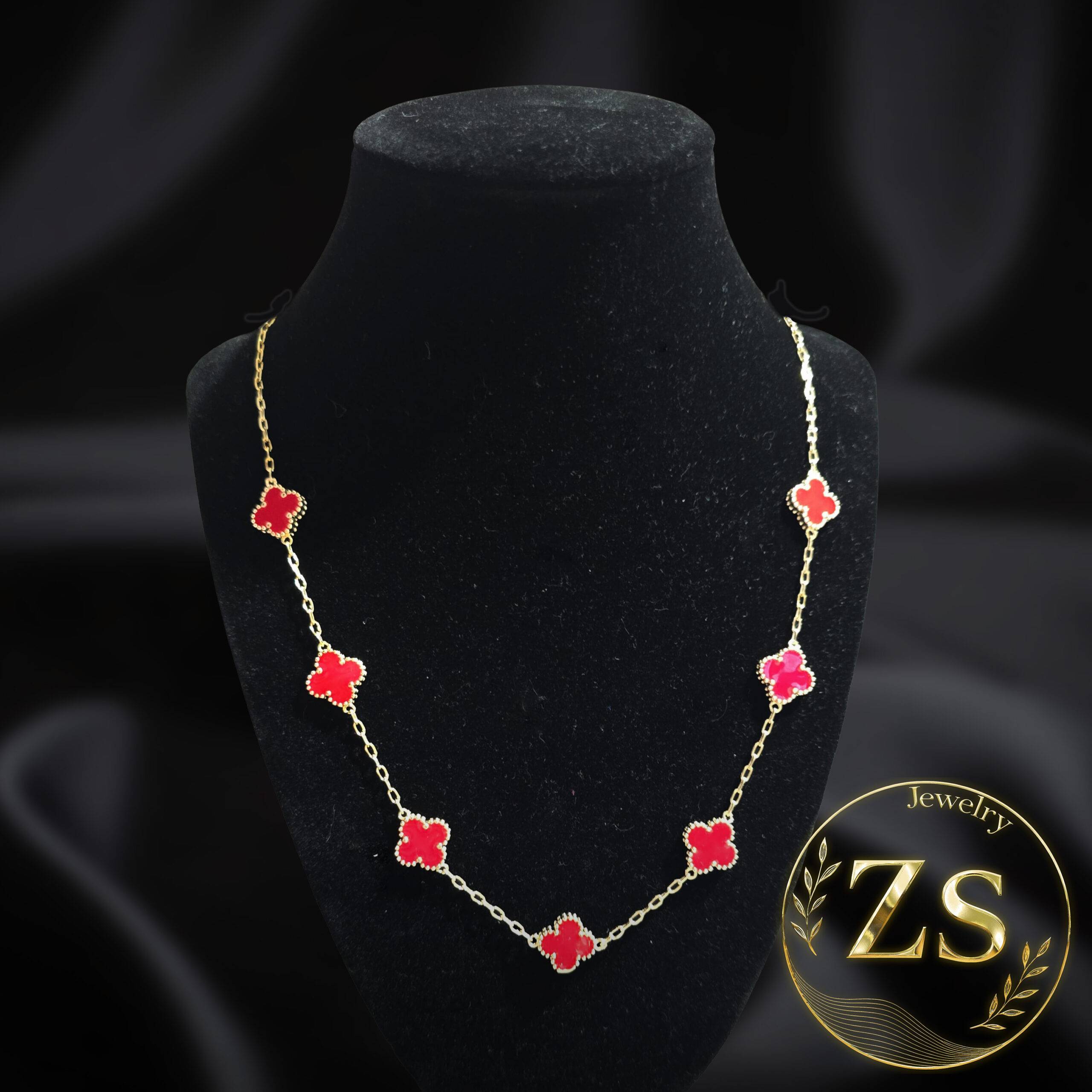Collar largo estilo estación con seis motivos de trébol rojo brillante distribuidos en cadena fina tono oro, sobre un maniquí en fondo negro. La pasión en tu collar de estación para un look dinámico.