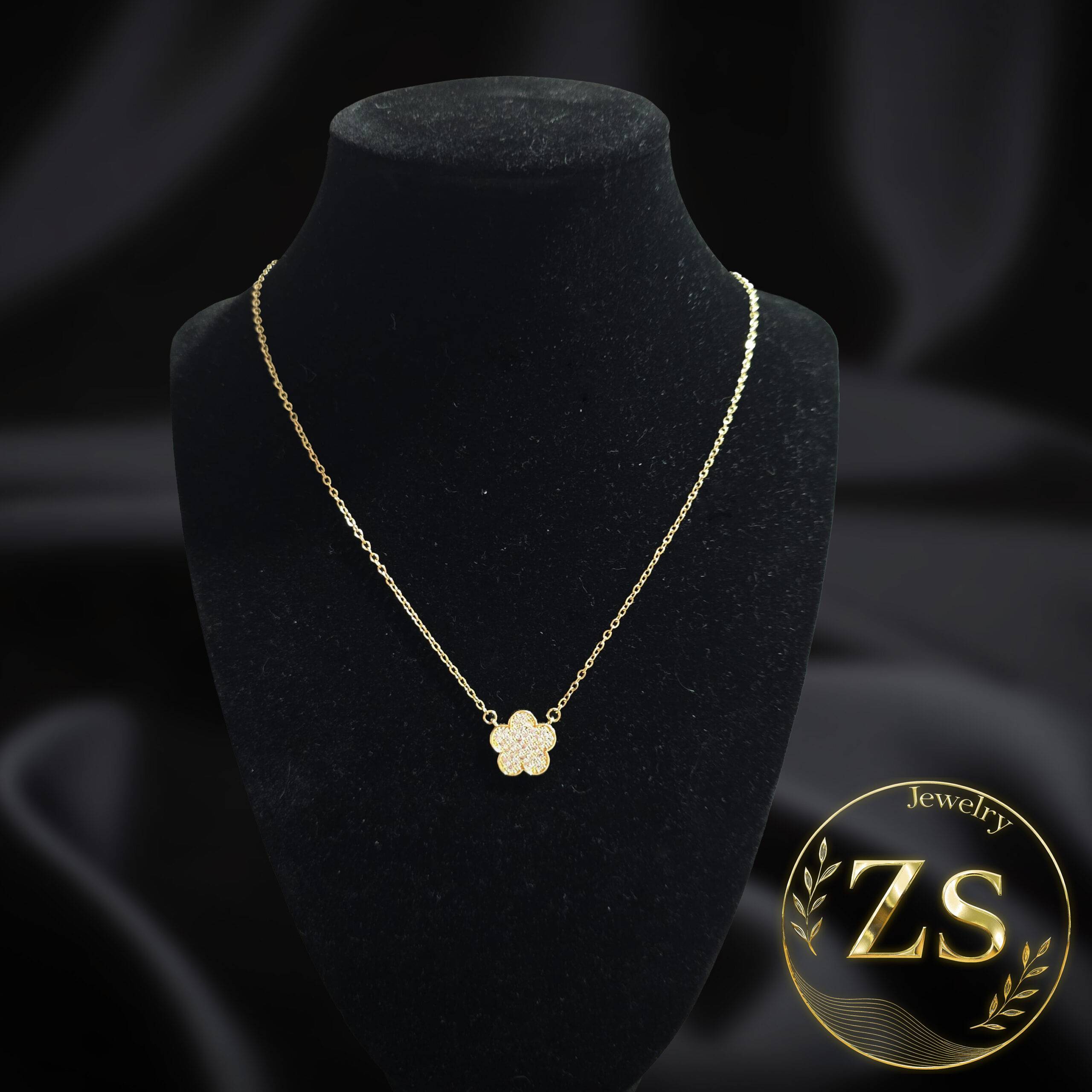 Collar de mujer con colgante de trébol completamente cubierto de circonitas brillantes en cadena tono oro, sobre un maniquí en fondo negro. La chispa brillante de la suerte en tu cuello.