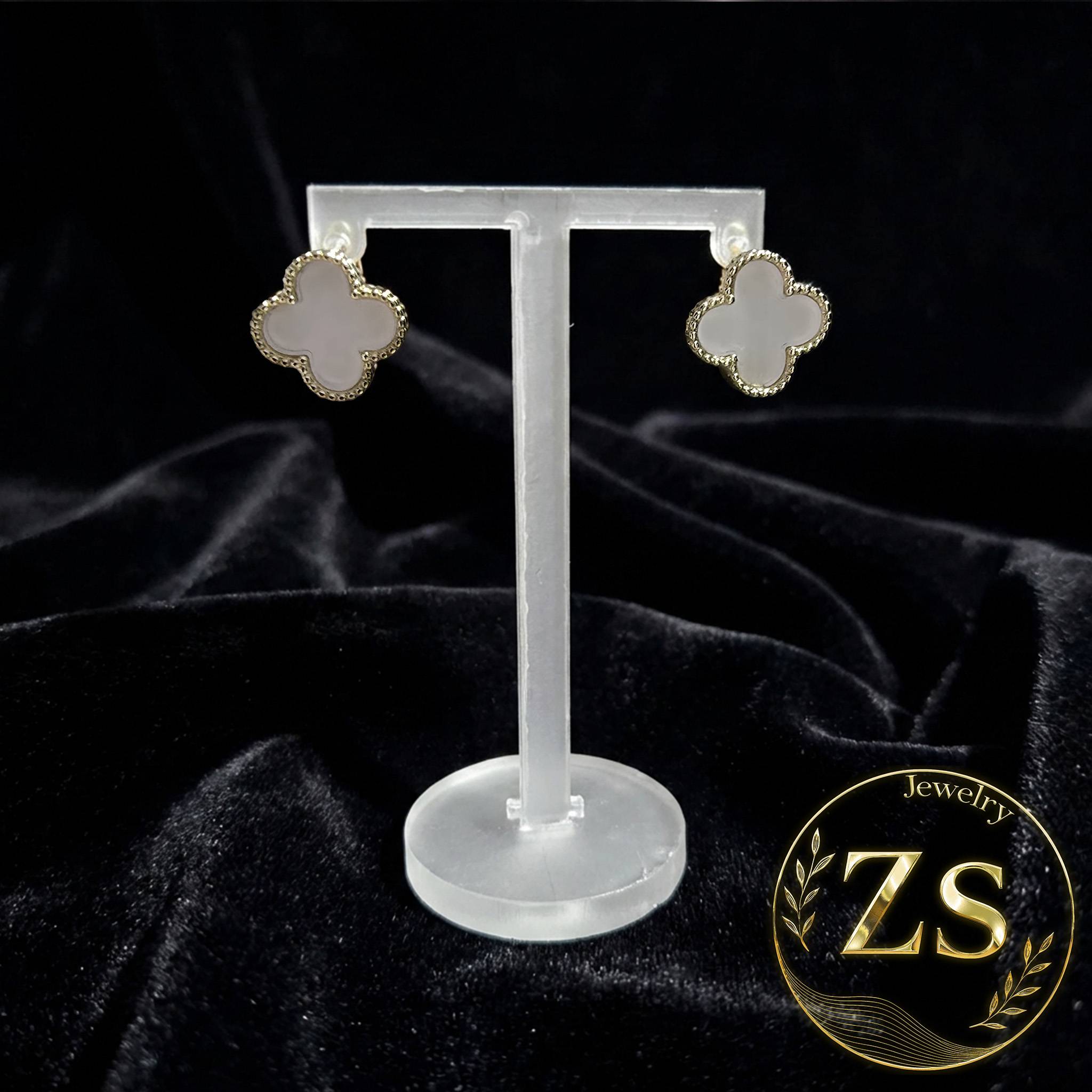 Pendientes minimalistas de trébol con relleno blanco perlado y borde dorado texturizado, presentados en soporte sobre fondo oscuro. Evocan pureza y elegancia atemporal, ideales para una imagen fresca, refinada y femenina con un lujo discreto.