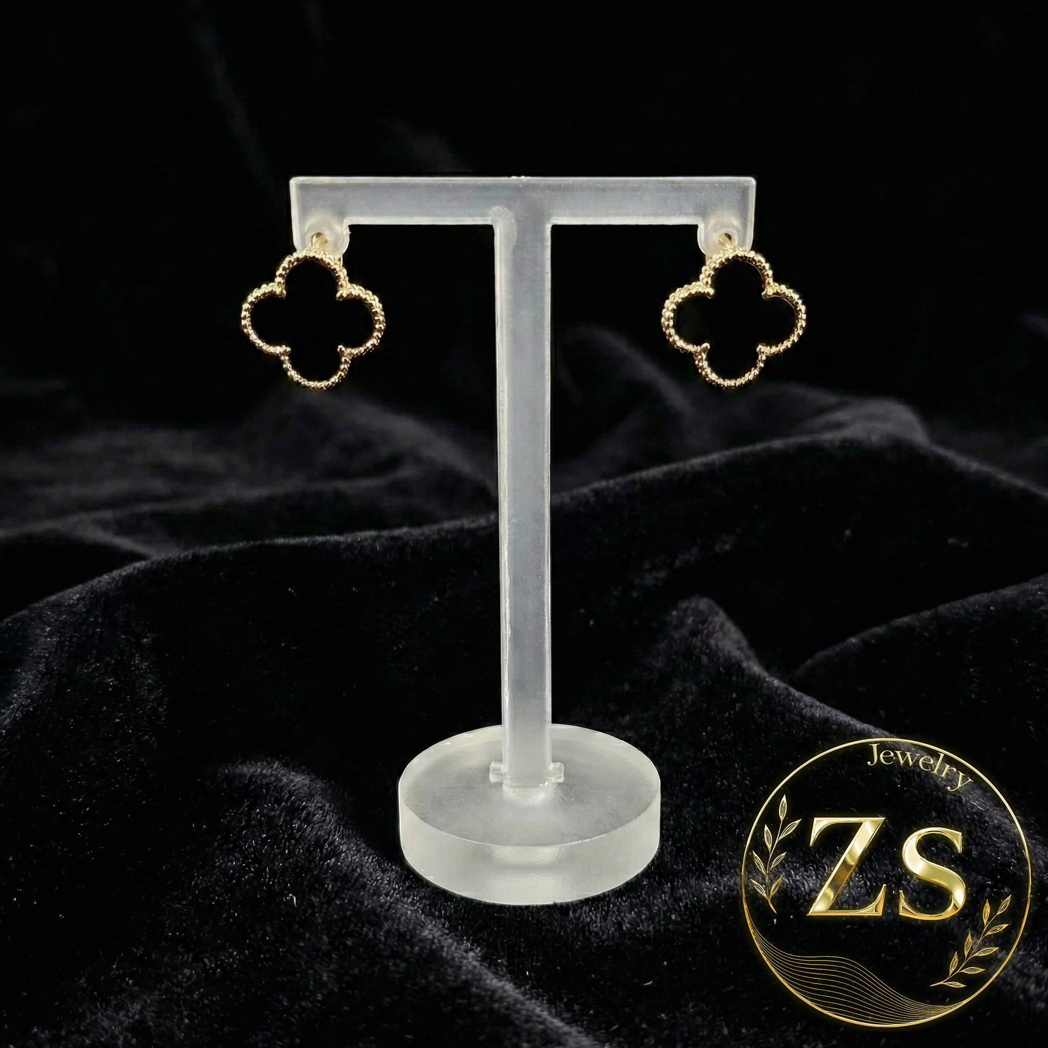 Pendientes de botón de trébol con centro negro profundo y contorno de micro-esferas doradas, sobre expositor de terciopelo negro. Ofrecen una elegancia sobria y misteriosa, aportando sofisticación inmediata a un estilo moderno y profesional.
