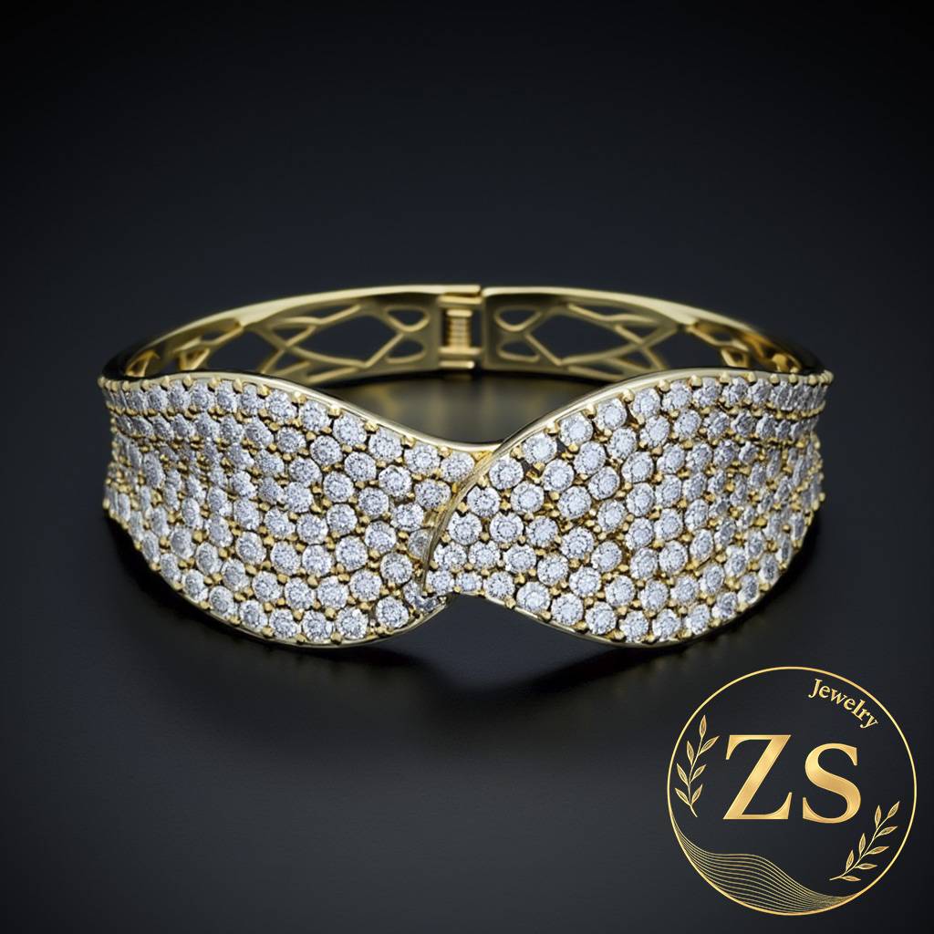 Este elegante brazalete de oro se distingue por su diseño en forma de lazo en el centro, creando un punto focal único y sofisticado. La superficie de la pieza está completamente cubierta por un deslumbrante engaste de diamantes en pavé, que captura la luz con cada movimiento. Su cierre seguro y su acabado pulido lo convierten en la joya perfecta para ocasiones especiales, aportando un toque de lujo y distinción a cualquier conjunto.