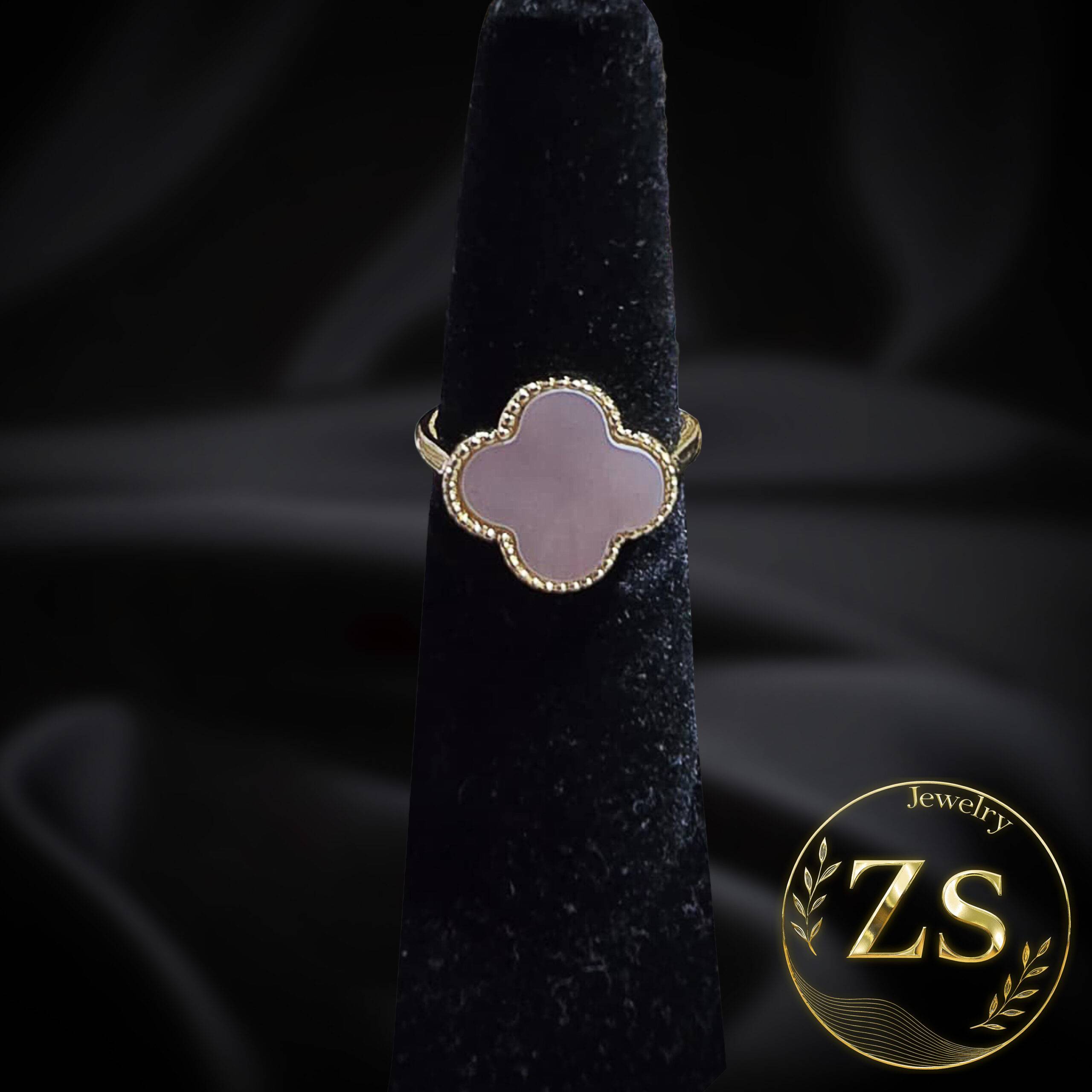Anillo de trébol de mujer en tono oro. Motivo central de nácar rosa pálido de brillo suave, en toma detallada sobre fondo negro. Delicadeza y suerte en la palma de tu mano.